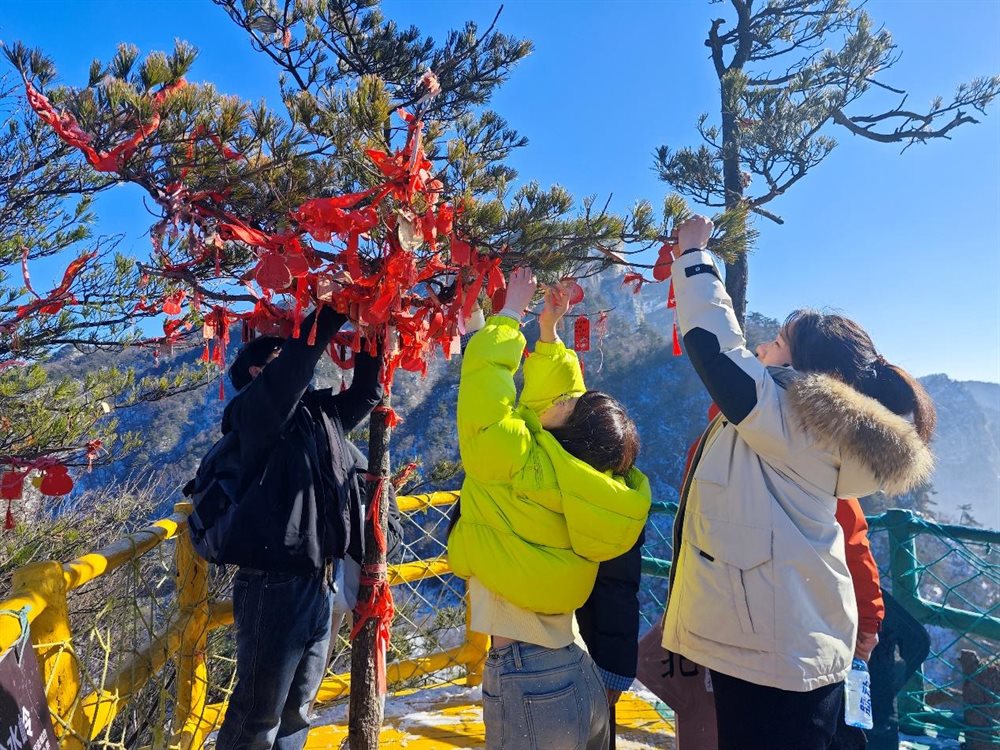 为了让游客畅享新春乐趣,景区精心打造了四大核心体验项目。登峰祈福纳祥活动,游客可登顶1910米分水岭观景台,悬挂马年专属祈福牌许愿,让巍峨山岭见证美好期许;云端极限挑战项目,游客既能挑战网红“云端飞拉达”,在悬崖峭壁间体验肾上腺素飙升的快感,又能在1830云顶咖啡厅打卡一杯“有高度的咖啡”,定格青春热血瞬间;新春市集寻味活动,游客可在云中花园逛市集,体验围炉煮茶、投壶射箭、非遗展演等活动,在欢声笑语中感受地道民俗风情;冰雪雾凇赏景活动,游客能观赏雪后银装素裹的山林与玉树琼枝般的雾凇,置身冰雪世界,定格浪漫瞬间。