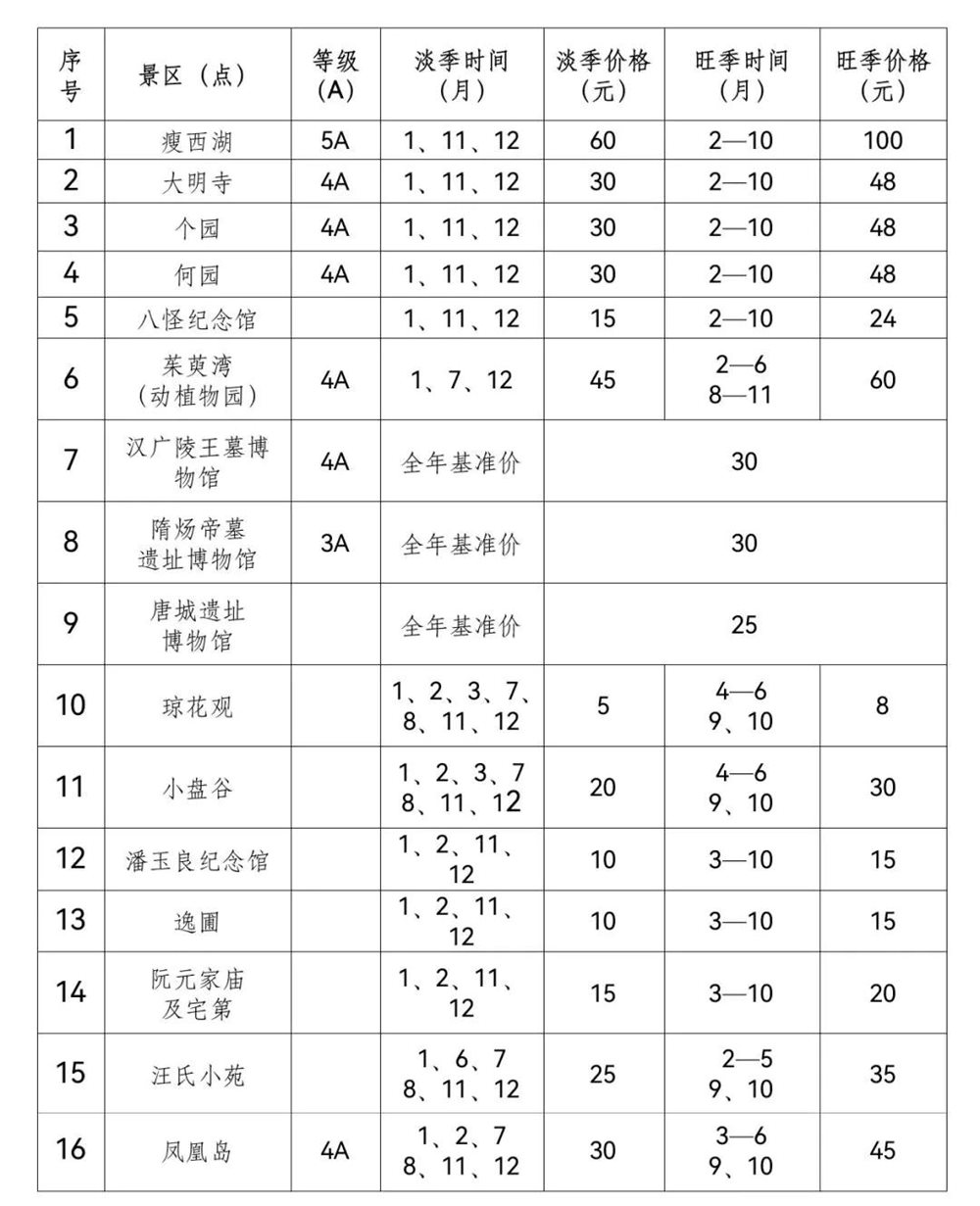 汉广陵王墓博物馆、隋炀帝墓遗址博物馆、唐城遗址博物馆,全年实行基准价,票价分别为30元、30元、25元;