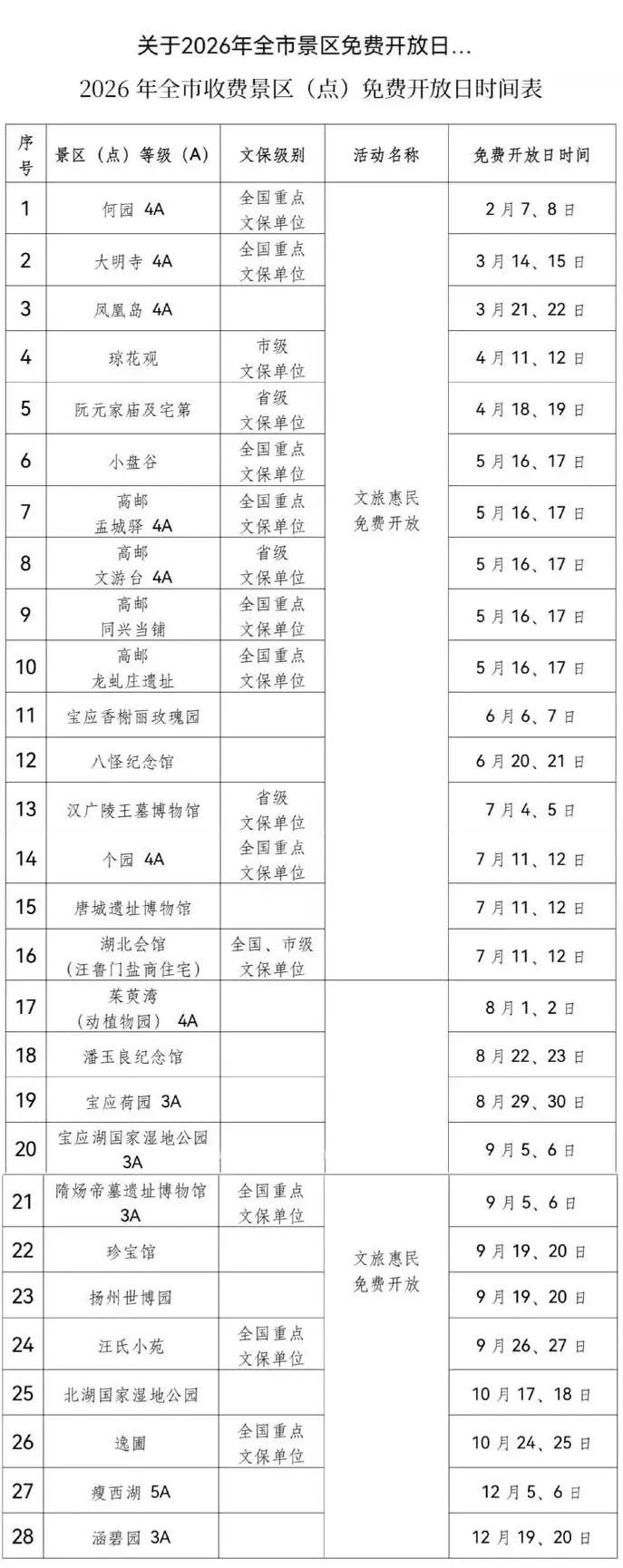 2.免费开放活动覆盖全市范围。不仅有瘦西湖、个园、何园、唐城遗址博物馆、茱萸湾风景区、凤凰岛生态旅游区等18个市区景点,还有邗江区北湖国家湿地公园、宝应县荷园、宝应湖国家湿地公园,仪征市红山体育公园、扬州世博园(仪征),江都区邵伯古镇,高邮市盂城驿、文游台、同兴当铺和龙虬庄遗址公园等县(市、区)景点,范围覆盖全市。