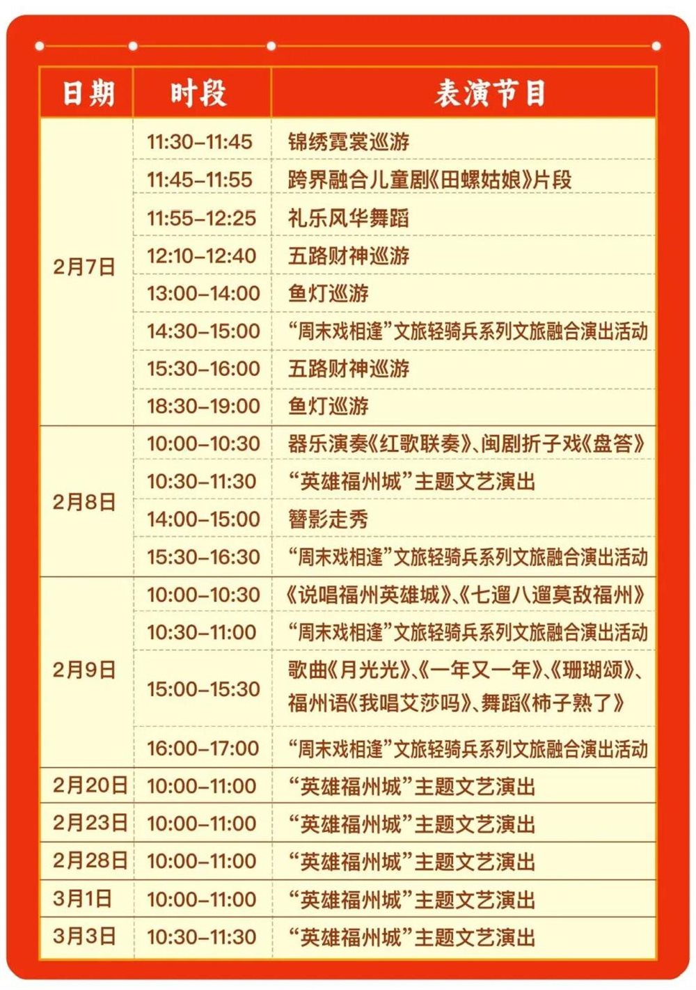 此外,游客服务中心内将举行非遗主题展演,每日不同时段轮番上演闽剧、“英雄福州城”主题文艺演出、三条簪及三把刀走秀、渔灯巡游等节目,让市民在游览过程中沉浸式体验民俗艺术。