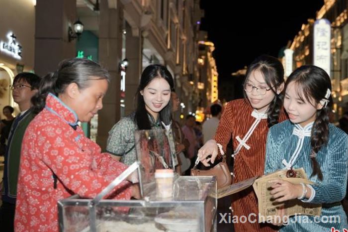 现场设置的骑楼廊影打卡点和岁月叙事廊打卡点,陈列着留声机、自行车、旧行李箱及满墙黑胶唱片,吸引众多游客驻足拍照。街头演艺《骑楼琴缘》在廊檐下浪漫上演,萨克斯与小提琴合奏出悠扬旋律,为百年建筑注入灵动气息。与此同时,骑楼芳华秀以十字街中心广场为舞台,《漫步人生路》《万水千山总是情》等粤语金曲接连唱响。