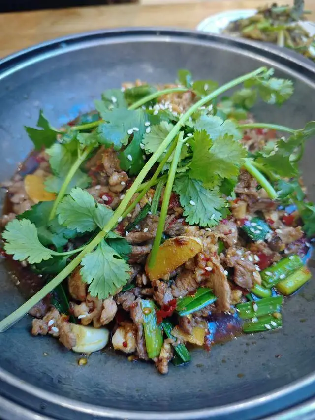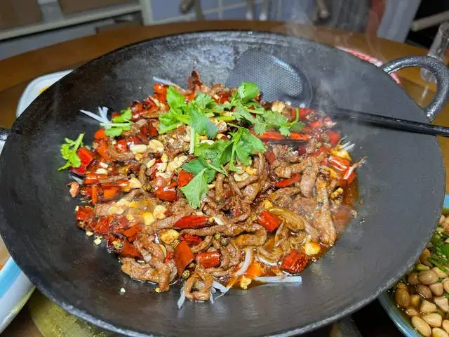 古代中原地区不能随意杀牛,导致牛肉的烹饪技术长期停滞不前。但贵州苗族地区则没有这个限制,养牛、斗牛、吃牛肉都是重要的文化习俗。因此贵州的牛肉相关的菜肴都十分出色,比如黄焖牛肉、干锅牛肉等。贵州许多地方的牛肉餐馆都非常出名,比如施秉牛肉、盘州牛肉等。和辣子鸡一样,贵州的干锅牛肉和川菜的不同,川菜的以豆瓣酱、剁椒等为调料,而贵州则以糟辣椒为调料。