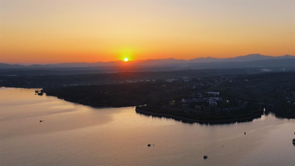 清晨的湖面洒满金色光芒,正午时分湛蓝通透,傍晚则被晚霞染成温暖的橘色。