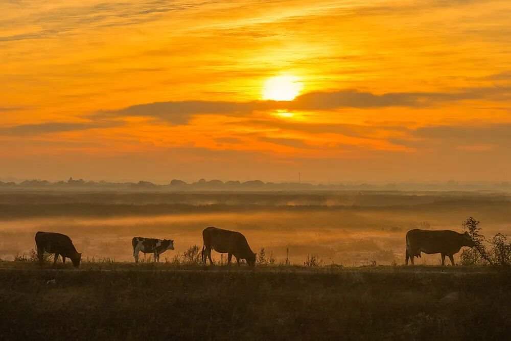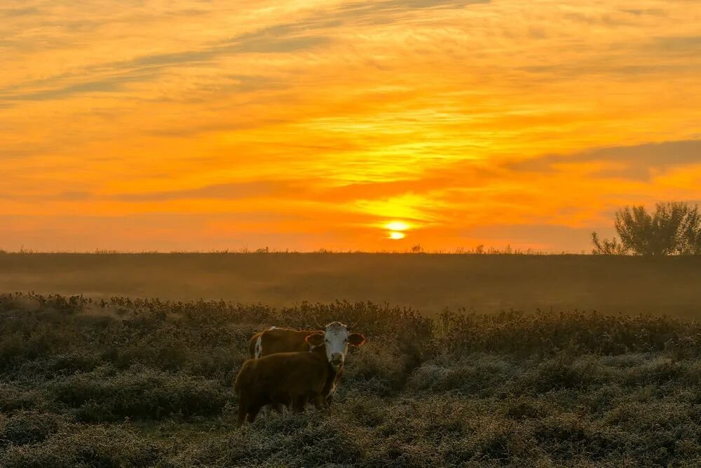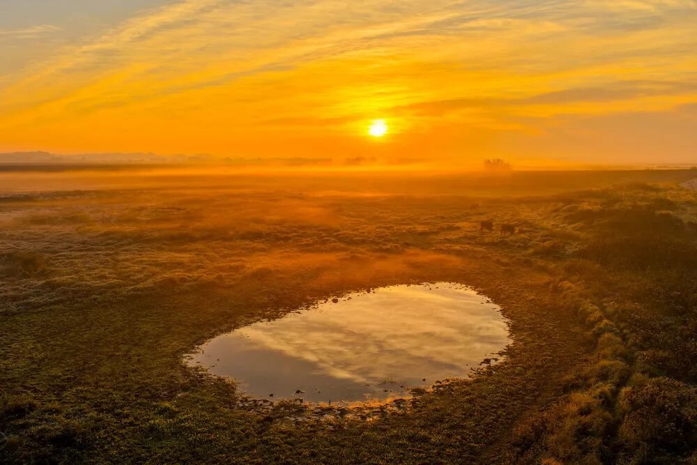 浅滩绿草间,牛羊踱步,低哞声轻扬,为静谧注入几分灵动。