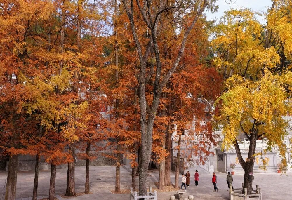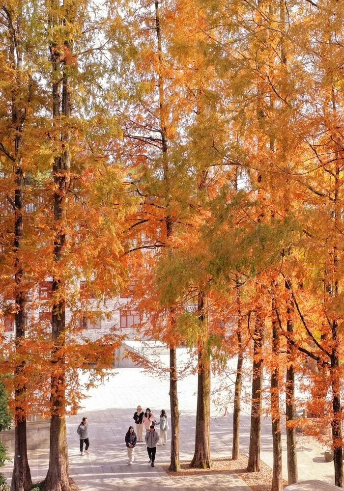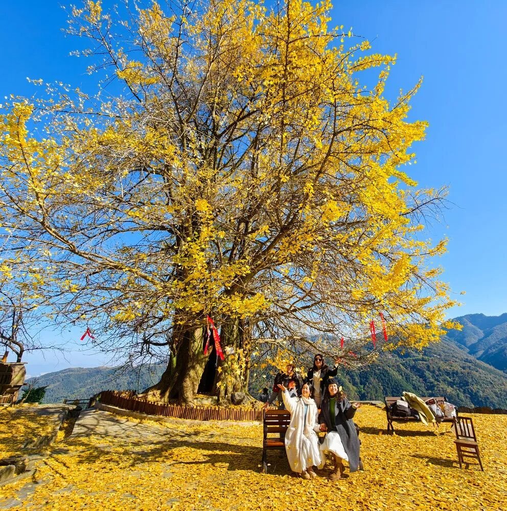 得益于独特的海拔与小气候,植被呈现出丰富的色彩层次。千年银杏通体金黄,与暖黄色的水杉林交织相映,共绘浓郁温暖的初冬画卷。