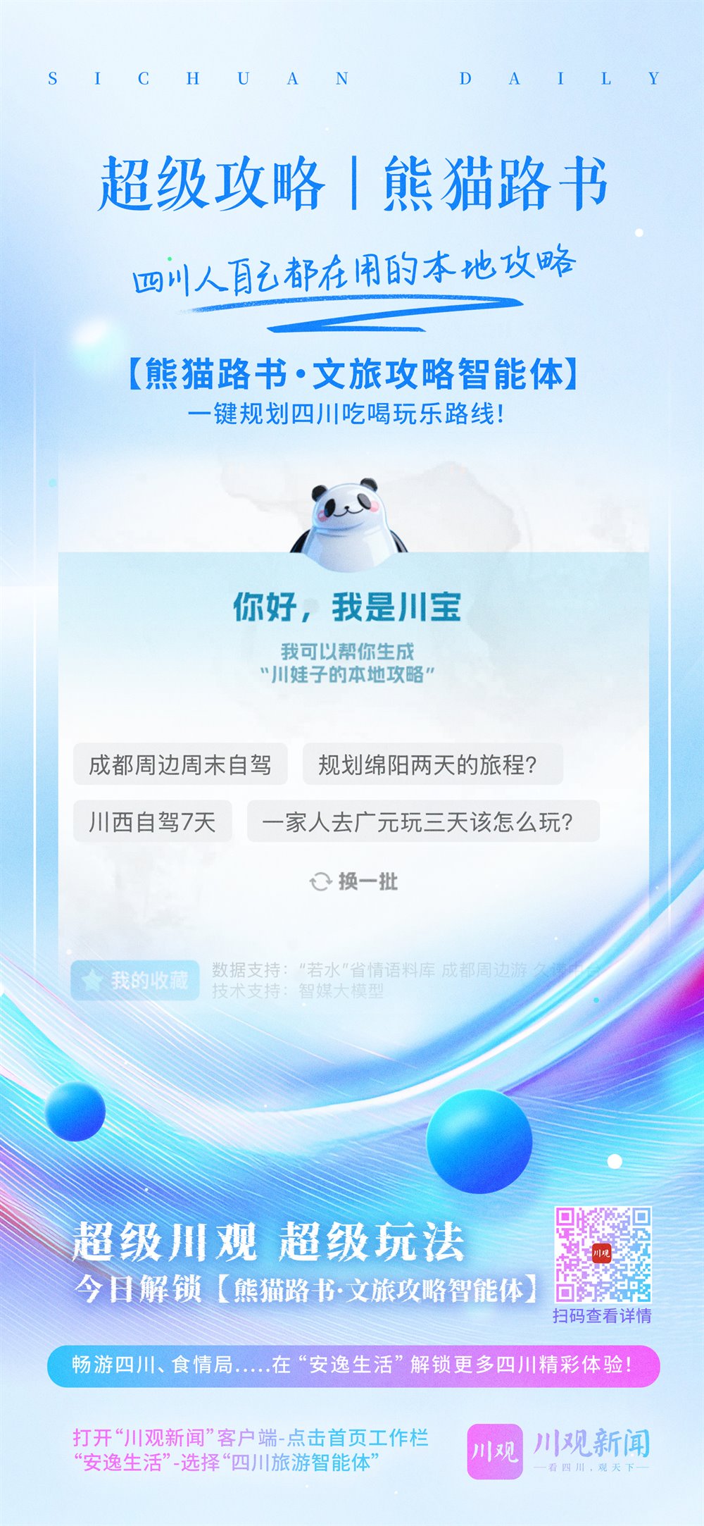 打开川观新闻客户端-点击首页工作栏“安逸生活”-选择“熊猫路书”文旅攻略智能体-和川宝一起旅行。
