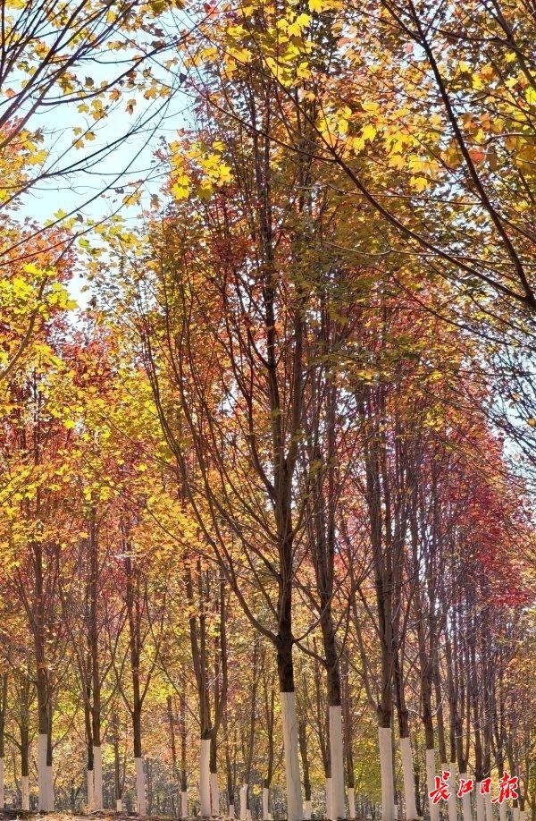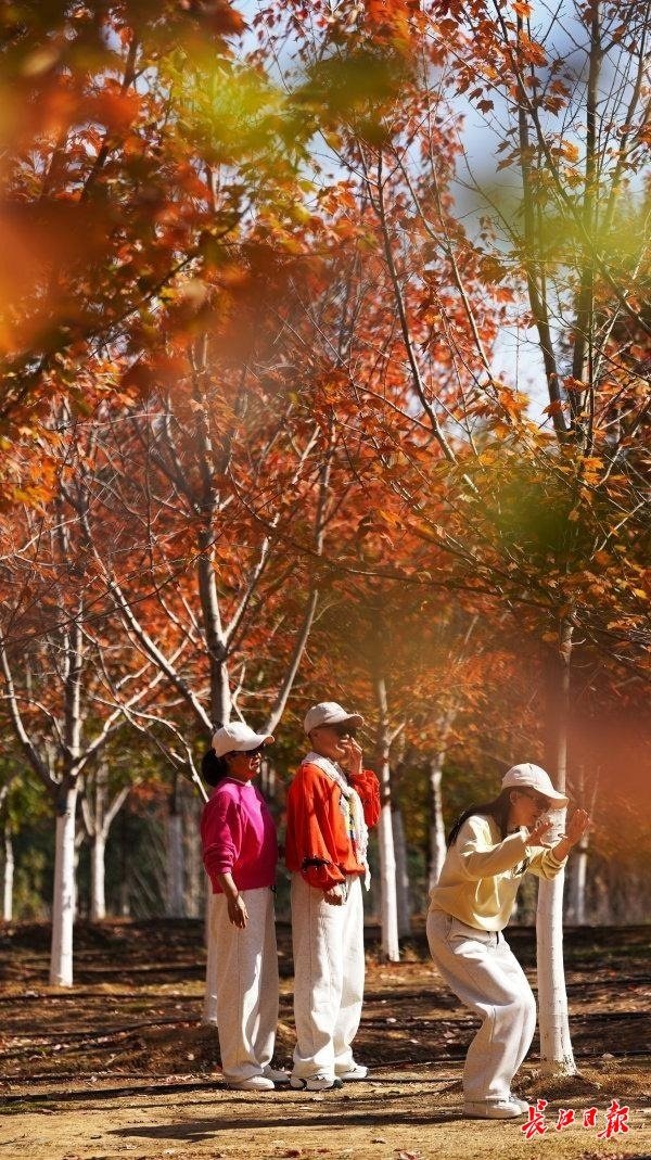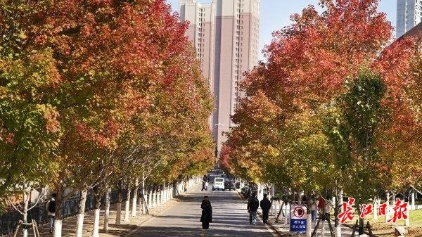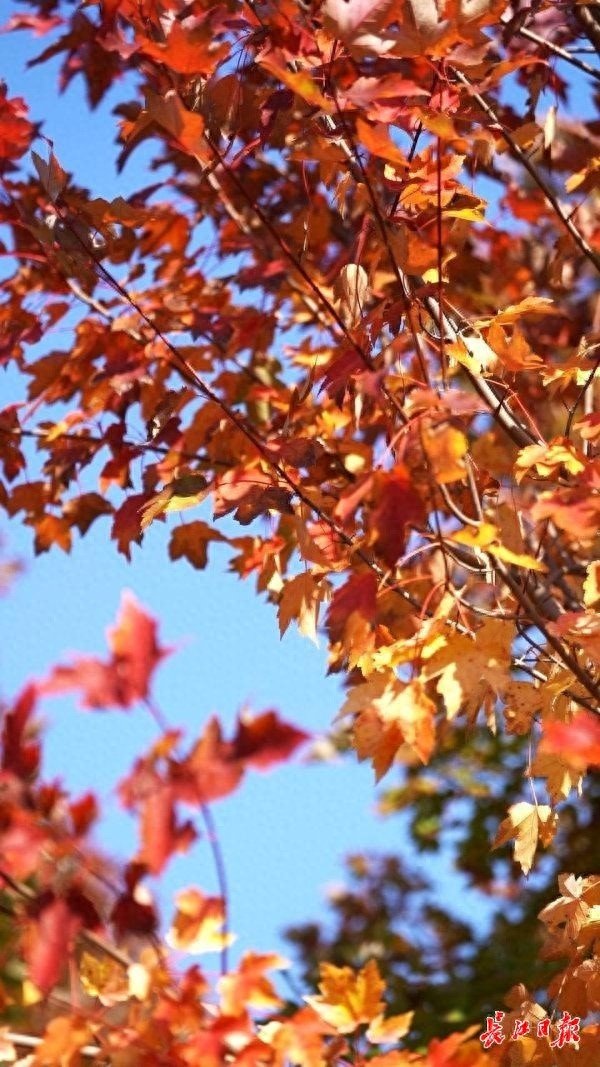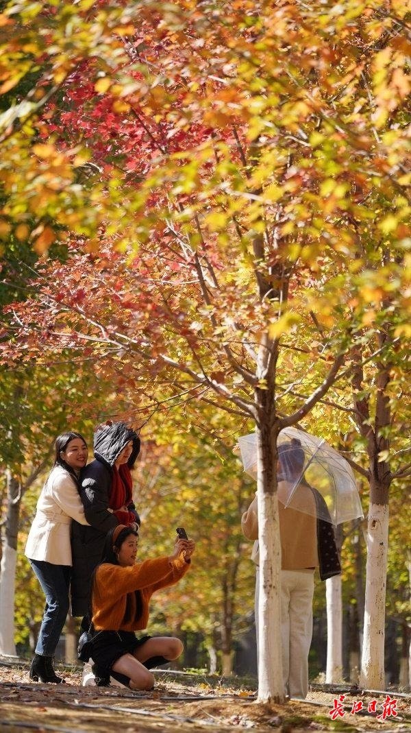 长江日报大武汉客户端11月19日讯 11月19日,武汉市东湖高新区文华学院内的红枫树换上了深红色外衣,吸引众多市民前来拍照游玩。据了解,文华学院内共种植有五种枫树,包括加拿大糖枫、美国红枫等,主要分布在图书馆前红枫大道、西南门红枫林及北门明湖湖畔红枫林三个区域。每到深秋,橙色、红色、黄色及绿色交织在一起,构成一幅五彩斑斓的画卷。