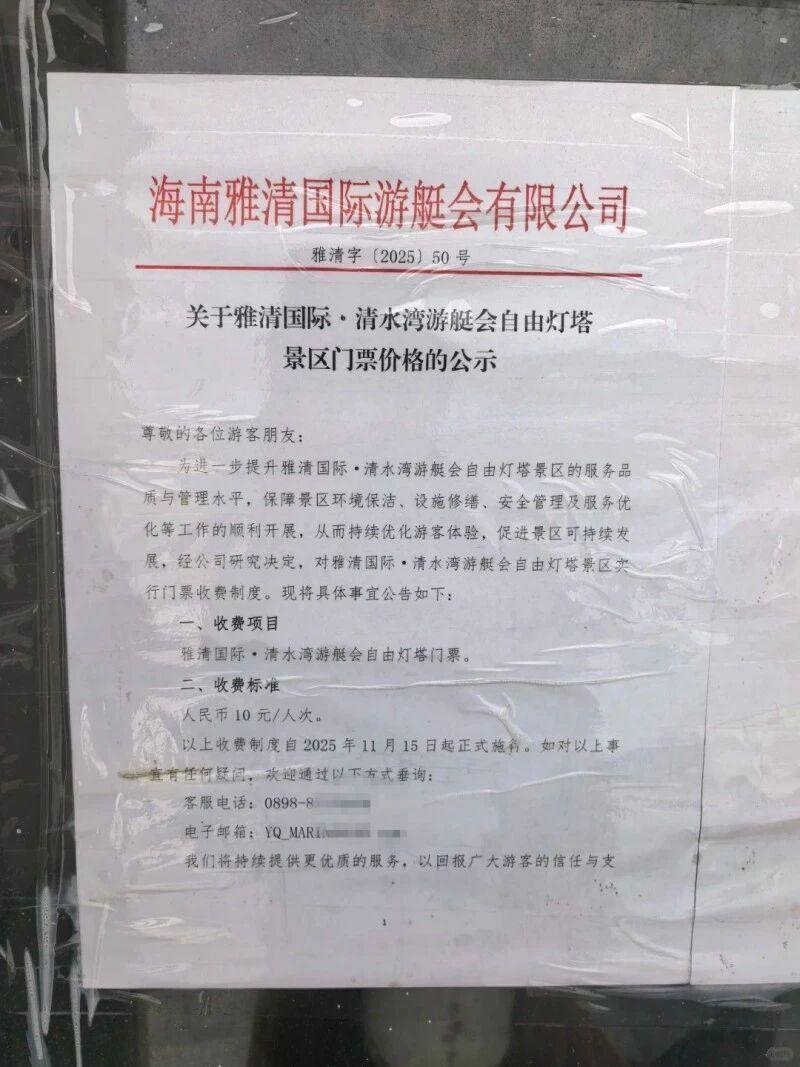 网红灯塔收费的帖文引发广泛热议,部分网友对其收费的合理性提出质疑;同时也有网友指出,免费景点能够通过带动住宿、餐饮及交通等相关产业,实现综合收益提升。相关配图显示,海南雅清国际游艇会有限公司此前发布了价格公示,明确清水湾游艇会自由灯塔自2025年11月15日起正式收费,收费标准为10元/次。