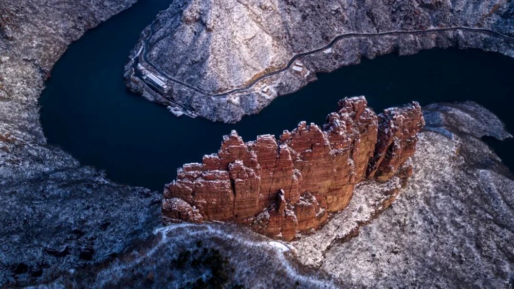 关山的红石崖壁在白雪映衬下