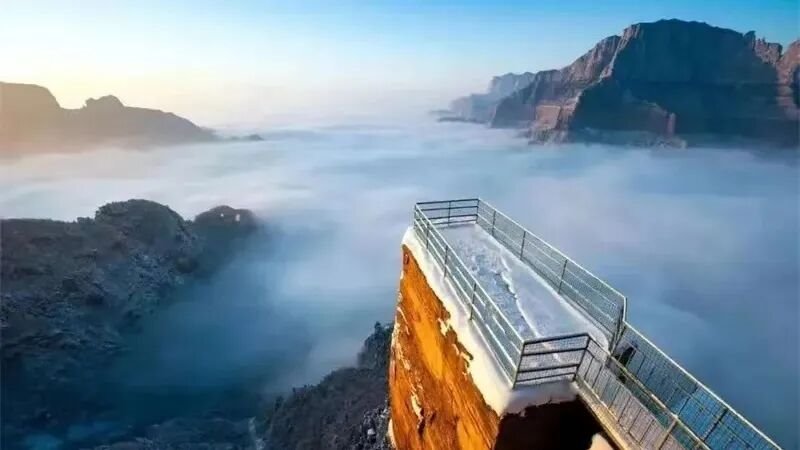 一边是悬崖峭壁的冰雪盛景