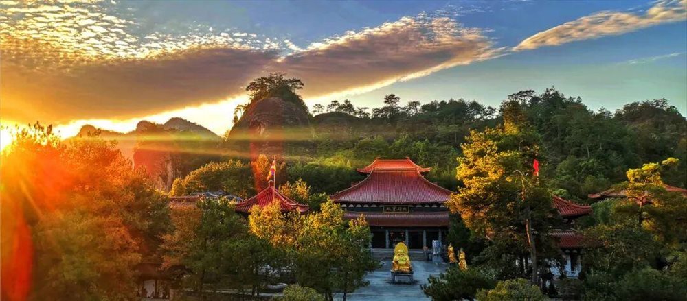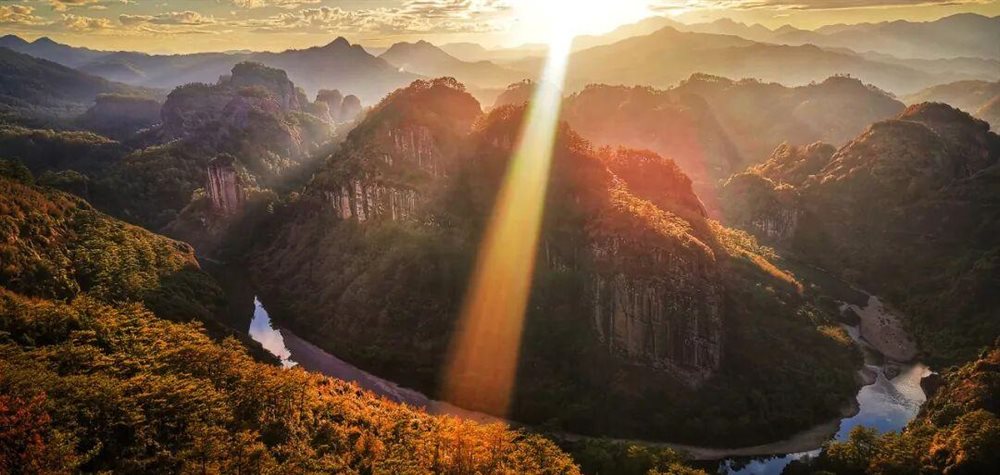 武夷山的落日则带着茶香。这个时候,虽非采茶季,但山间的茶田仍泛着淡淡的清香,夕阳西下时,晚霞与云海交融,紫蓝色的天幕下,九曲溪的溪水泛着金光。
