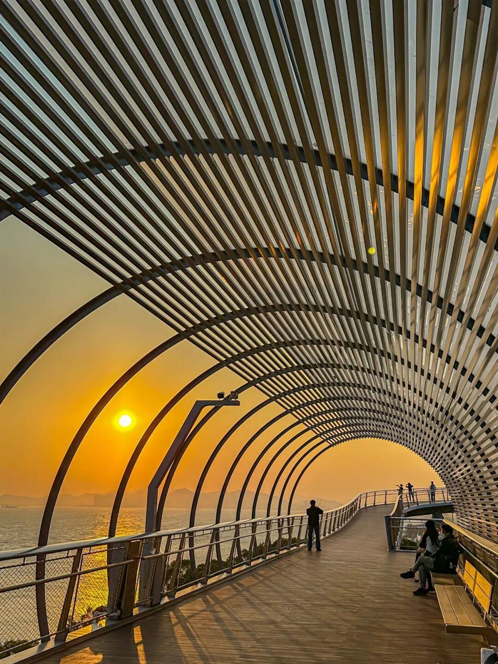 每当夕阳西下时,金色光芒洒在环形桥面上,仿佛与海平面无缝衔接。