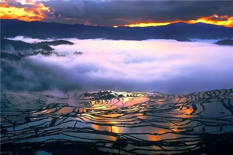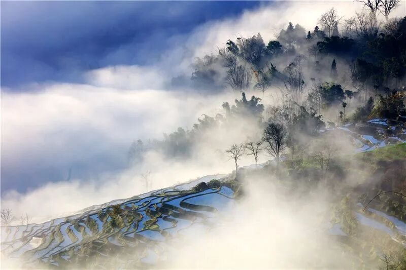 冬日,灌满水的万亩梯田如同一面面巨大的天空之镜,倒映着流云。