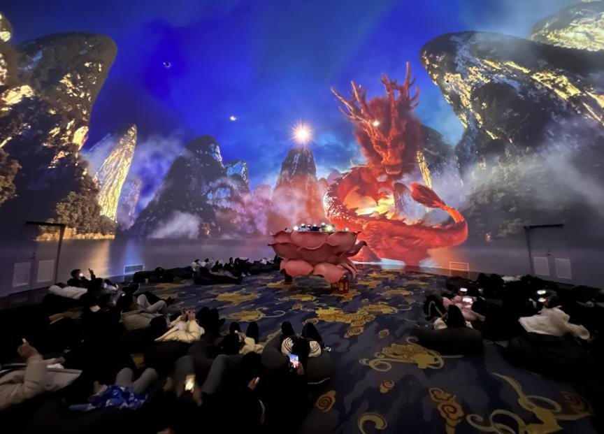 “体味北魏风骨,梦回隋唐盛世”——直径17米的超大水平全息天幕,360度无死角体验,裸眼5D带来的绝佳视觉享受,让你从龙的图腾“起身”,沿着历史脉络依次穿越上古、战国、北魏、隋唐等时期,再到现代龙门石窟景区。